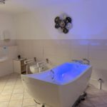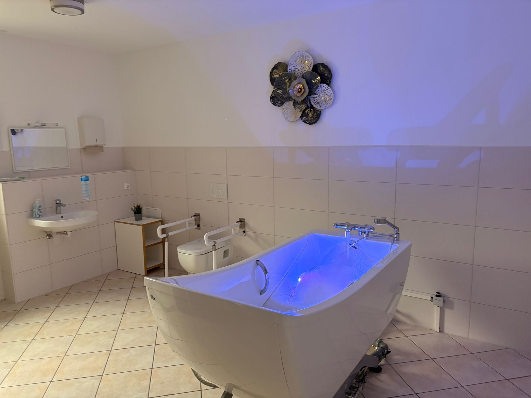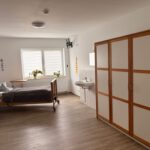 In der unteren Etage haben wir insgesamt sechs Klient*innenzimmer, eine Gästetoilette und zwei behindertengerechte, ebenerdige Pflegebäder für die Bewohner*innen. In einem der zwei Pflegebäder ist eine spezielle Pflegebadewanne mit Wellnessfunktionen vorhanden. Von ihren Zimmern aus gelangen die Bewohner*innen barrierefrei und direkt auf die großzügige, um das Haus herum angelegte Terrasse.